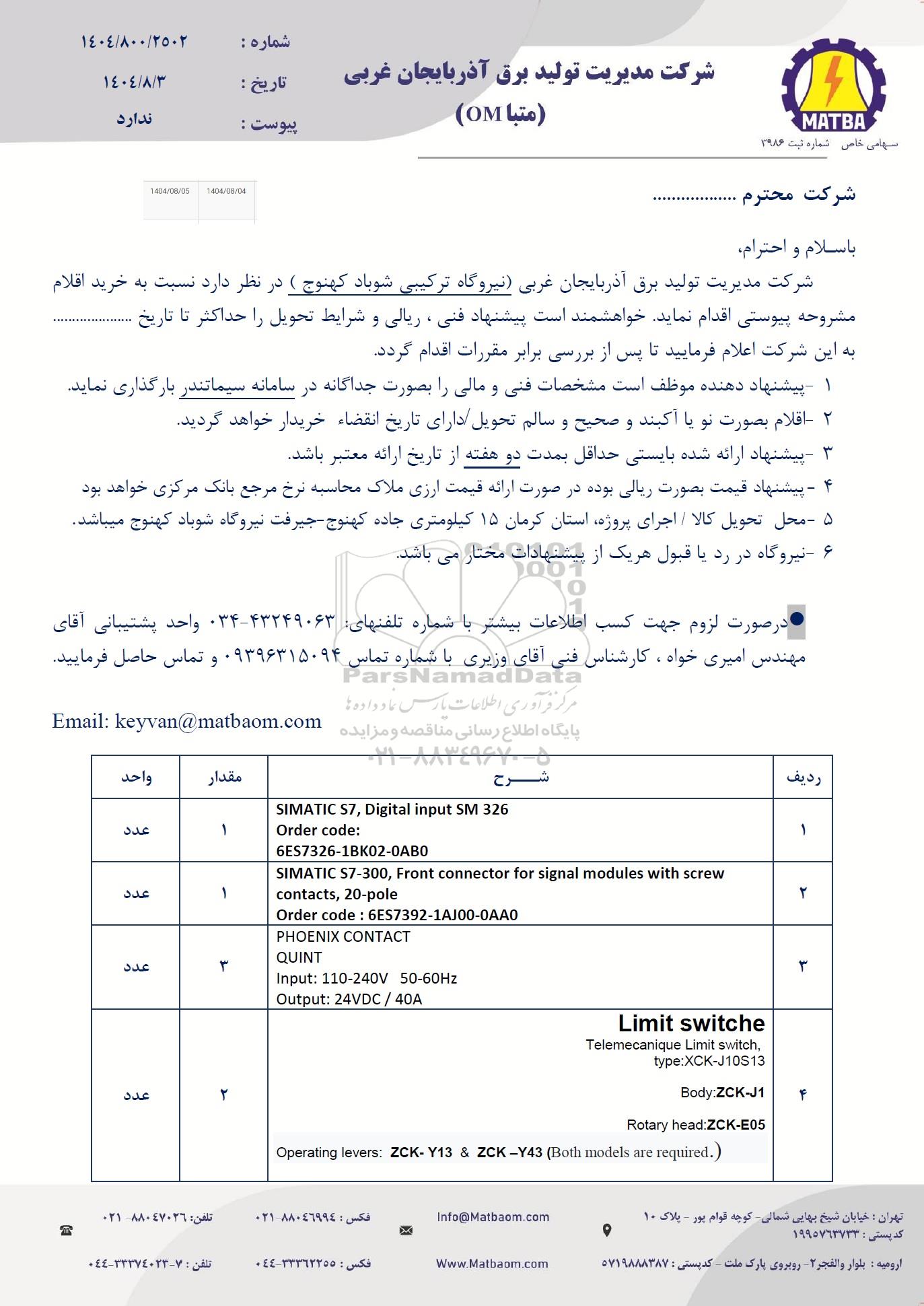 شرکت مدیریت تولید برق آذربایجان غربی (نیروگاه ترکیبی شوباد کهنوج) در نظر دارد نسبت به خرید اقلام مشروحه پیوستی اقدام نماید خواهشمند است پیشنهاد فنی، ریالی و شرایط تحویل را حداکثر تا تاریخ... به این شرکت اعلام فرمایید تا پس از بررسی برابر مقررات اقدام گردد.