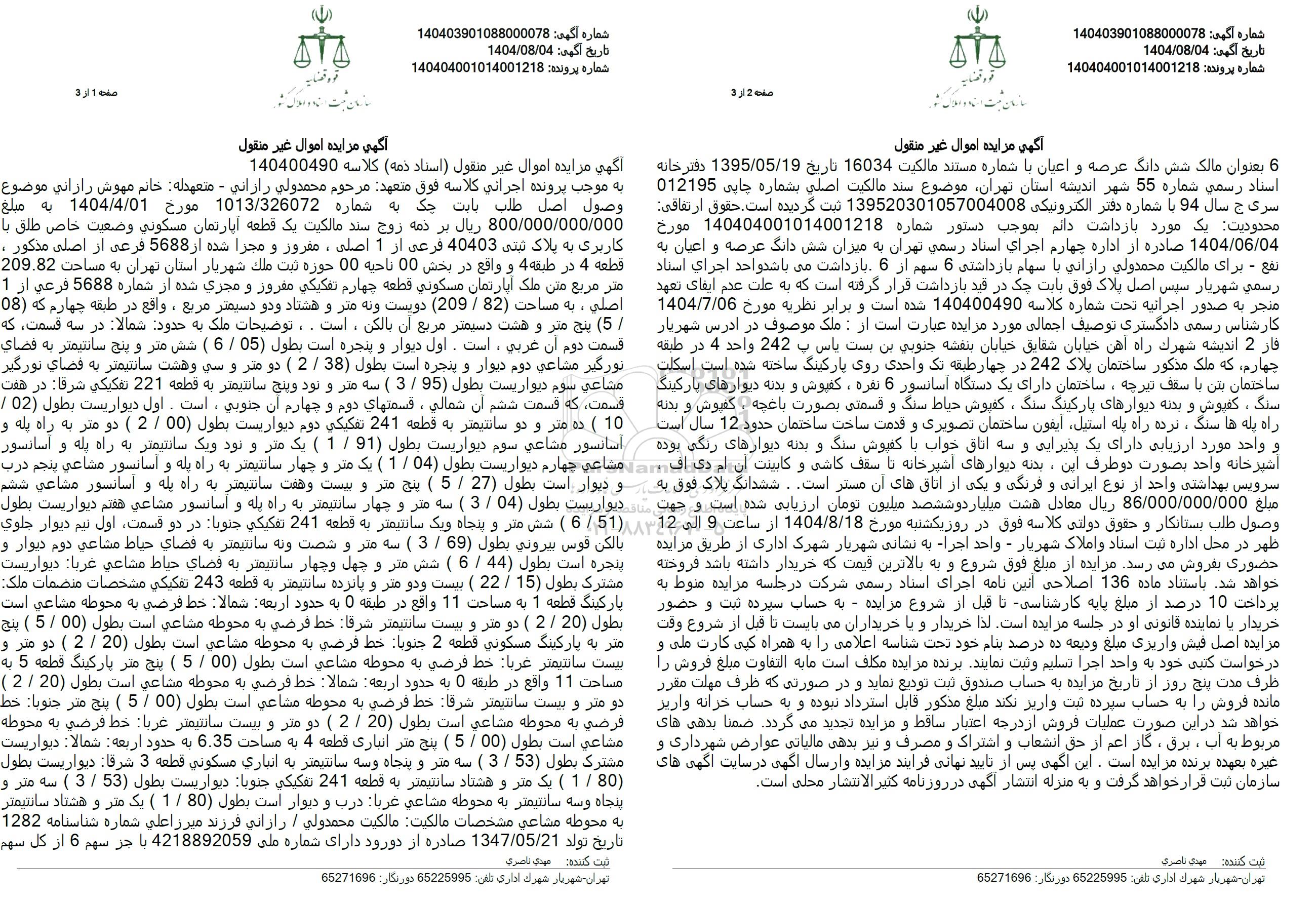تلفن:5- 88349670 (021) فکس: 88349673 (021) Website: www.ParsNamadData.com E-mail: Info@ParsNamadData.com مزایده فروش یک قطعه آپارتمان مسکونی وضعیت خاص طلق با کاربری به پلاک ثبتی 40403 فرعی از 1 اصلی