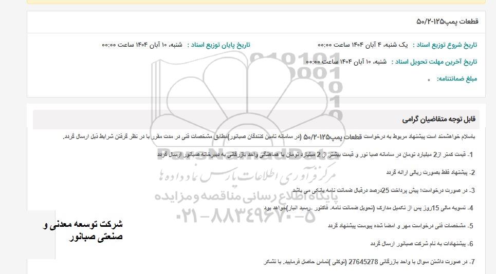 خواهشمند است پیشنهاد مربوط به درخواست قطعات پمپ 125-50/2 در (سامانه تامین کنندگان صبانور) مطابق مشخصات فنی در مدت مقرر با در نظر گرفتن شرایط ذیل ارسال گردد.