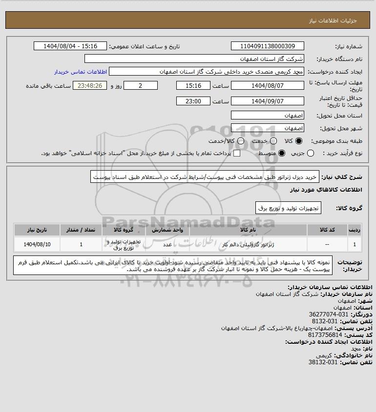 تلفن:5- 88349670 (021) فکس: 88349673 (021) Website: www.ParsNamadData.com E-mail: Info@ParsNamadData.com استعلام خرید دیزل ژنراتور طبق مشخصات فنی پیوست/شرایط شرکت در استعلام طبق اسناد پیوست