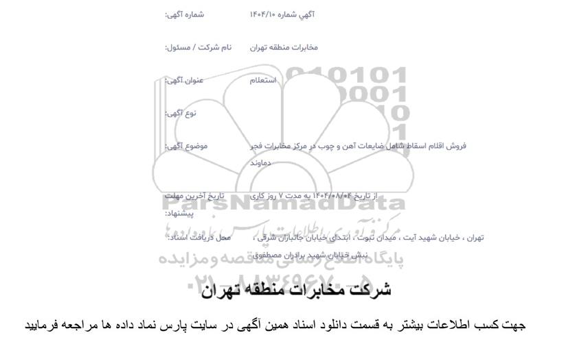 تلفن:5- 88349670 (021) فکس: 88349673 (021) Website: www.ParsNamadData.com E-mail: Info@ParsNamadData.com مزایده فروش اقلام اسقاط شامل ضایعات آهن و چوب