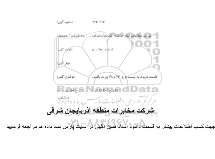 تلفن:5- 88349670 (021) فکس: 88349673 (021) Website: www.ParsNamadData.com E-mail: Info@ParsNamadData.com تجدید استعلام کاست مربوط به پست نوری 24 و 48 پورت باکس