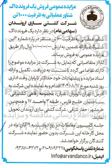 شرکت کشتی سازی اروندان (سهامی عام) در نظر دارد یک فروند داک شناور عملیاتی به ظرفیت 1000 تن مستقر در یارد شماره 2  این شرکت با ارائه تضمین به ارزش 100.000.000.000 ریال را از طریق مزایده عمومی به فروش برساند.