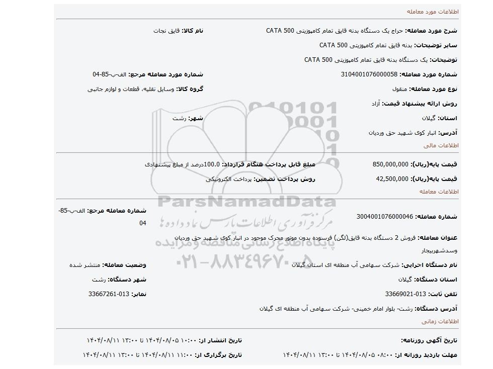 | شماره معامله: 3004001076000046 | | شماره معامله مرجع: الف-ب-85-04 | | عنوان معامله: فروش 2 دستگاه بدنه قایق(لگن) فرسوده بدون موتور محرک موجود در انبار کوی شهید حق وردیان وسدشهربیجار | | نام دستگاه اجرایی: شرکت سهامی آب منطقه ای استان گیلان | | وضعیت معامله: منتشر شده | | استان دستگاه: گیلان | | شهر دستگاه: رشت | | تلفن ثابت: 013-33669021 | | نمابر: 013-33667261 | | آدرس دستگاه: رشت- بلوار امام خمینی- شرکت سهامی آب منطقه ای گیلان |