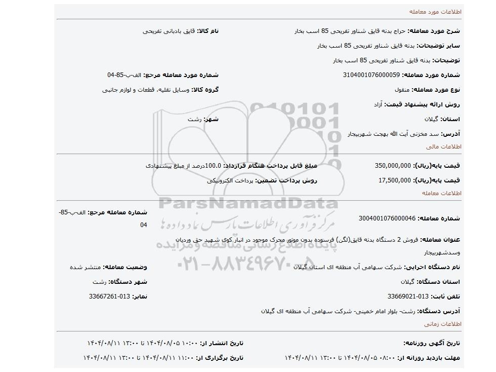 | تاریخ آگهی روزنامه: | | تاریخ انتشار از: ۱۴۰۴/۰۸/۰۵ ۱۰:۰۰ تا ۱۴۰۴/۰۸/۱۱ ۱۳:۰۰ | | مهلت بازدید روزانه از: ۱۴۰۴/۰۸/۰۵ ۰۸:۰۰ تا ۱۴۰۴/۰۸/۱۱ ۱۳:۰۰ | | تاریخ برگزاری از: ۱۴۰۴/۰۸/۱۱ ۱۱:۰۰ تا ۱۴۰۴/۰۸/۱۱ ۱۳:۰۰ |