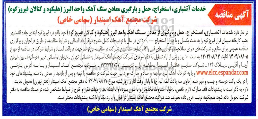 در نظر دارد خدمات آتشباری، استخراج، حمل و بارگیری از معادن سنگ آهک واحد البرز (هلیکوه و کتالان فیروز کوه) خود واقع در فیروزکوه ابتدای جاده قائمشهر جنب کارخانه سیمان فراز فیروز کوه را به مدت یکسال و با میزان استخراج 200.000 تن در سال با توضیحات کامل مندرج در قرارداد الصاقی و شرایط مناقصه، از طریق فراخوان و برگزاری مناقصه عمومی برای منابع و شرکتهای دارای صلاحیت و توانایی های فنی واگذار نماید. متقاضیان شرکت در مناقصه میتوانند جهت دریافت اسناد و شرایط شرکت در مناقصه از مورخ 1404.08.05 لغایت 1404.08.14 به مدت 10 روز و بغیر از ایام تعطیل به دفتر مرکزی شرکت مجتمع آهک اسپندار به نشانی تهران - خیابان لواسانی غربی (فرمانیه) - بین خیابان آریا و آقایی - پلاک 114 - شرکت صنایع عمران اسپندار - طبقه اول - کدپستی 1937744757 - شرکت مجتمع آهک اسپندار و یا به آدرس اینترنتی www.elcc.espandar.com و یا به کارخانه آهک البرز مراجعه و اسناد و مدارک مورد نیاز جهت شرکت در مناقصه را تهیه و پس از بازدید از معادن یاد شده پیشنهادهای خود را در یک پاکت دربسته و چسب و مهر شده حاوی سه پاکت الف ب ج تا پایان وقت اداری روز شنبه مورخ 1404.08.17 به دفتر مجتمع آهک اسپندار (دفتر تهران) تحویل نمایند. لازم به ذکر است به پیشنهادات فاقد مدارک لازم ناقص ناخوانا مشروط، مخدوش و یا بدون سپرده و یا اینکه بعد از مهلت مقرر و خارج از ضوابط مشخص شده در اسناد مناقصه به دفتر شرکت تحویل داده شود هیچگونه ترتیب اثری داده نخواهد شد. شرکت مجتمع آهک اسپندار در قبول و یا رد یک و یا کلیه پیشنهادات مختار است.