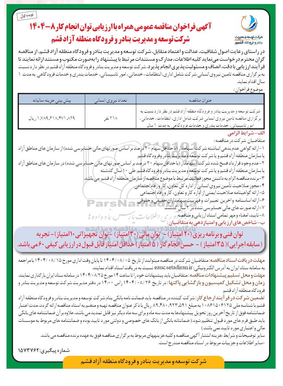 در راستای رعایت اصول شفافیت، عدالت و اعتماد متقابل، شرکت توسعه و مدیریت بنادر و فرودگاه منطقه آزاد قشم، از مناقصه گران محترم درخواست می نماید کلیه اطلاعات، مدارک و مستندات مرتبط با پیشنهاد را به صورت مکتوب و مستند ارائه نمایند تا فرآیند ارزیابی با دقت، انصاف و مسئولیت پذیری انجام پذیرد. شرکت توسعه و مدیریت بنادر و فرودگاه منطقه آزاد قشم در نظر دارد نسبت به برگزاری مناقصه تامین نیروی انسانی شرکت شامل اداری، انتظامات، خدماتی، امور تاسیساتی، خدمات بندری و خدمات فرودگاهی به مدت 1 سال اقدام نماید.