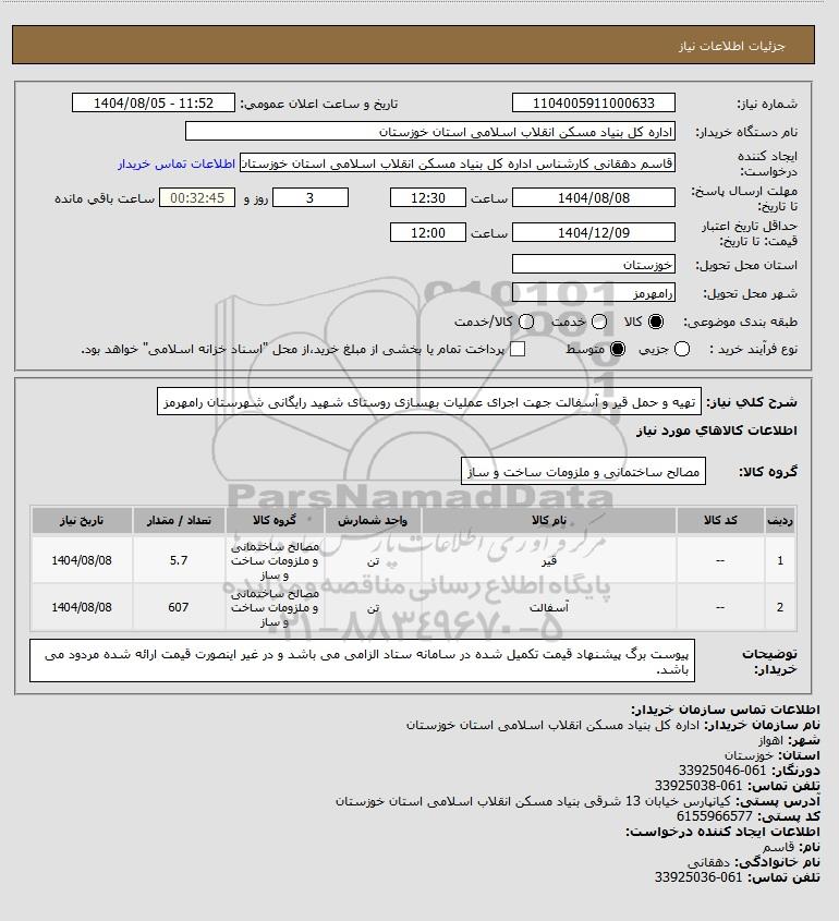 تلفن:5- 88349670 (021) فکس: 88349673 (021) Website: www.ParsNamadData.com E-mail: Info@ParsNamadData.com استعلام تهیه و حمل قیر و آسفالت جهت اجرای عملیات بهسازی روستای شهید رایگانی شهرستان رامهرمز