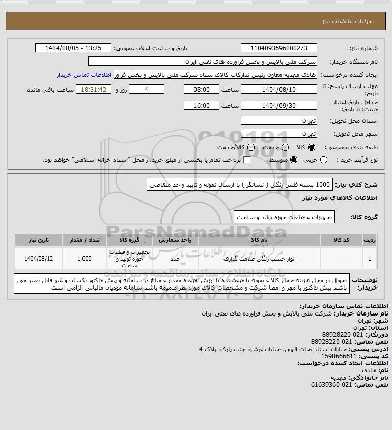 تلفن:5- 88349670 (021) فکس: 88349673 (021) Website: www.ParsNamadData.com E-mail: Info@ParsNamadData.com استعلام 1000 بسته فلش رنگی ( نشانگر ) با ارسال نمونه و تایید واحد متقاضی