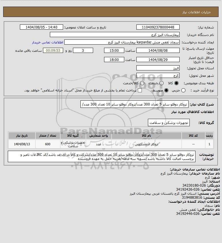 تلفن:5- 88349670 (021) فکس: 88349673 (021) Website: www.ParsNamadData.com E-mail: Info@ParsNamadData.com استعلام تروکار دوقلو سایز 5 تعداد 300 عدد/تروکار دوقلو سایز 10 تعداد 300 عدد/
