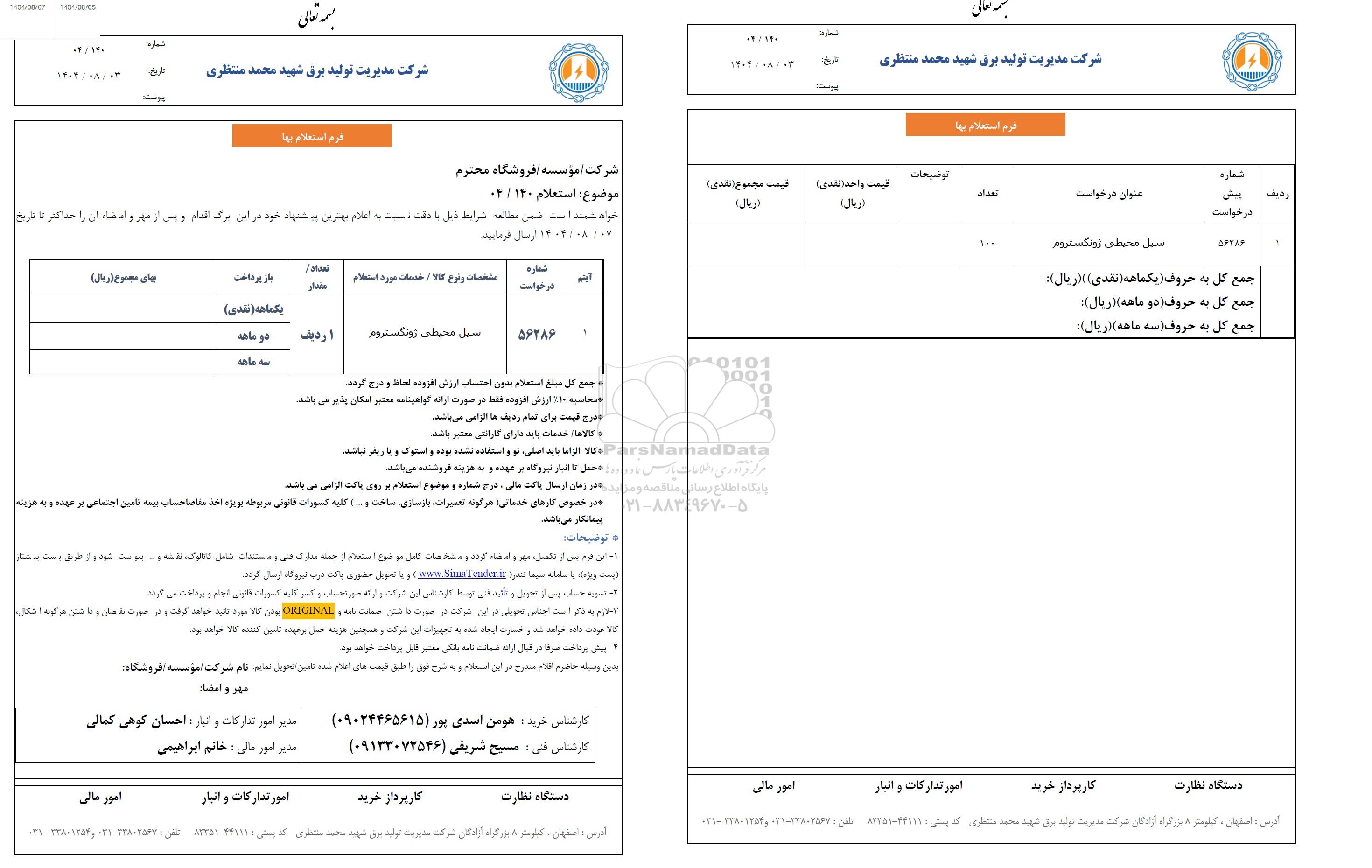 1- این فرم پس از تکمیل، مهر و امضاء گردد و مشخصات کلی موضوع استعلام از جمله مدارک فنی و مستندات شامل کاتالوگ نقشه و... پیوست شود و از طریق پست پیشتاز (پست ویژه) یا سامانه سیما تندر WWW.simaTender.ir و یا تحویل حضوری پاکت درب نیروگاه ارسال کردند.