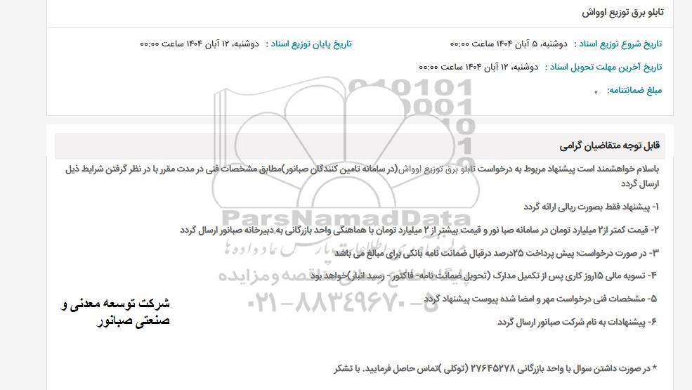 با سلام خواهشمند است پیشنهاد مربوط به درخواست تابلو برق توزیع اوواش (در سامانه تامین کنندگان صبانور) مطابق مشخصات فنی در مدت مقرر با در نظر گرفتن شرایط ذیل ارسال گردد