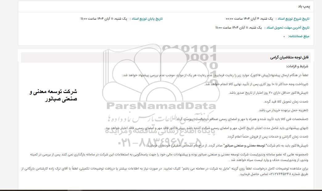 - برای مشاهده توضیحات کامل درخواست لطفاً روی گزینه مایل به شرکت در معامله میباشم کلیک نمایید. در صورت نیاز به اطلاعات بیشتر یا دریافت توضیحات تکمیلی لطفاً با آقای ترک زاده کارشناس بازرگانی از طریق شماره 02127645248 تماس حاصل فرمایید.