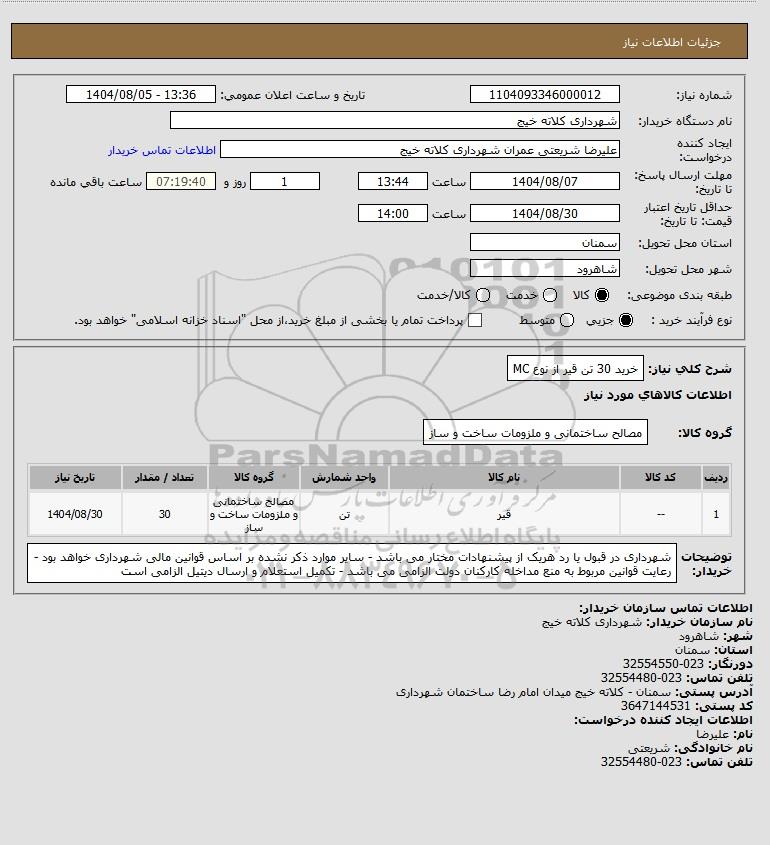 تلفن:5- 88349670 (021) فکس: 88349673 (021) Website: www.ParsNamadData.com E-mail: Info@ParsNamadData.com استعلام خرید 30 تن قیر از نوع MC