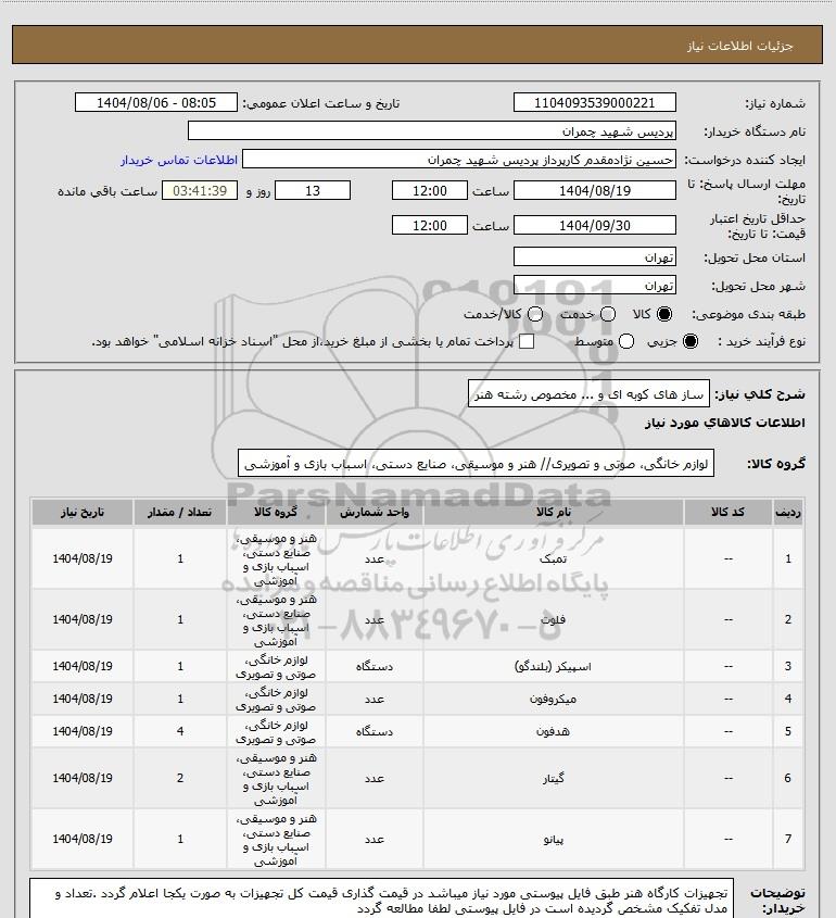 تلفن:5- 88349670 (021) فکس: 88349673 (021) Website: www.ParsNamadData.com E-mail: Info@ParsNamadData.com استعلام ساز های کوبه ای و ... مخصوص رشته هنر