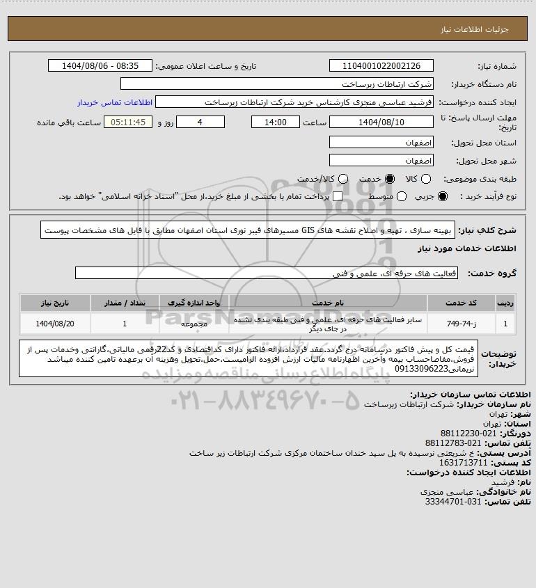 تلفن:5- 88349670 (021) فکس: 88349673 (021) Website: www.ParsNamadData.com E-mail: Info@ParsNamadData.com استعلام بهینه سازی تهیه و اصلاح نقشه های GIS مسیرهای فیبر نوری استان اصفهان مطابق با فایل های مشخصات پیوست