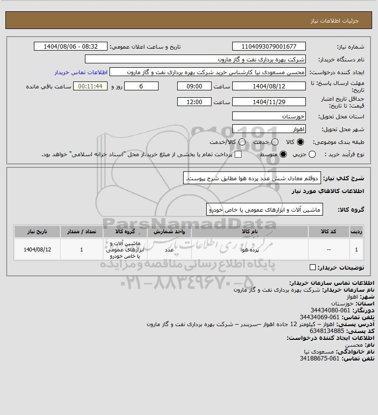 تلفن:5- 88349670 (021) فکس: 88349673 (021) Website: www.ParsNamadData.com E-mail: Info@ParsNamadData.com استعلام دوقلم معادل شش عدد پرده هوا مطابق شرح پیوست.