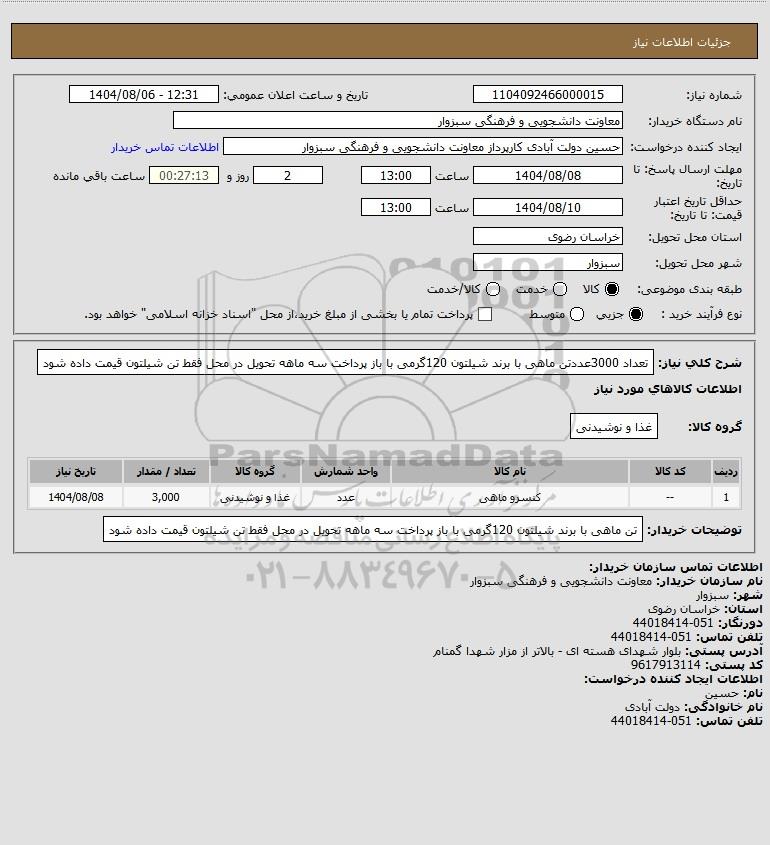 تلفن:5- 88349670 (021) فکس: 88349673 (021) Website: www.ParsNamadData.com E-mail: Info@ParsNamadData.com استعلام تعداد 3000عددتن ماهی با برند شیلتون 120گرمی با باز پرداخت سه ماهه تحویل در محل فقط تن شیلتون قیمت داده شود