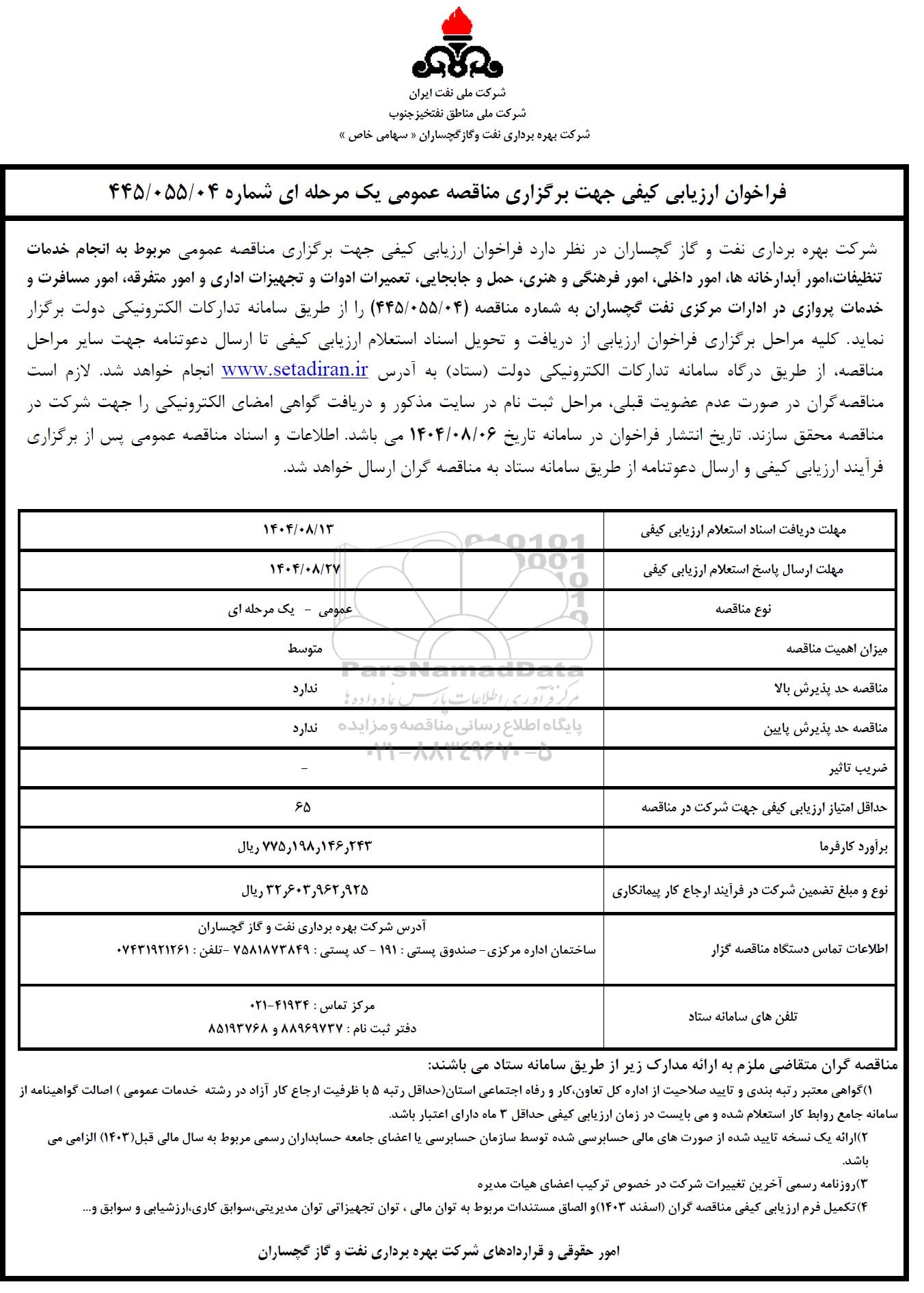 شرکت بهره برداری نفت و گاز گچساران در نظر دارد فراخوان ارزیابی کیفی جهت برگزاری مناقصه عمومی مربوط به انجام خدمات تنظیفات، امور آبدارخانه ها، امور داخلی، امور فرهنگی و هنری، حمل و جابجایی، تعمیرات ادوات و تجهیزات اداری و امور متفرقه، امور مسافرت و خدمات پروازی در ادارات مرکزی نفت گچساران به شماره مناقصه 445.055.04 را از طریق سامانه تدارکات الکترونیکی دولت برگزار نماید کلیه مراحل برگزاری فراخوان ارزیابی از دریافت و تحویل اسناد استعلام ارزیابی کیفی تا ارسال دعوتنامه جهت سایر مراحل مناقصه از طریق درگاه سامانه تدارکات الکترونیکی دولت (ستاد) به آدرس سایت ستاد انجام خواهد شد. لازم است مناقصه گران در صورت عدم عضویت قبلی مراحل ثبت نام در سایت مذکور و دریافت گواهی امضای الکترونیکی را جهت شرکت در مناقصه محقق سازند. تاریخ انتشار فراخوان در سامانه تاریخ 1404.8.6 میباشد. اطلاعات و اسناد مناقصه عمومی پس از برگزاری فرآیند ارزیابی کیفی و ارسال دعوتنامه از طریق سامانه ستاد به مناقصه گران ارسال خواهد شد.