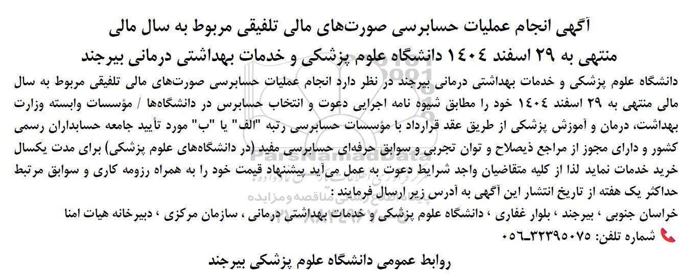 آگهی انجام عملیات حسابرسی صورت های مالی تلفیقی مربوط به سال مالی منتهی به 29 اسفند 1404 دانشگاه علوم پزشکی و خدمات بهداشتی درمانی بیرجند