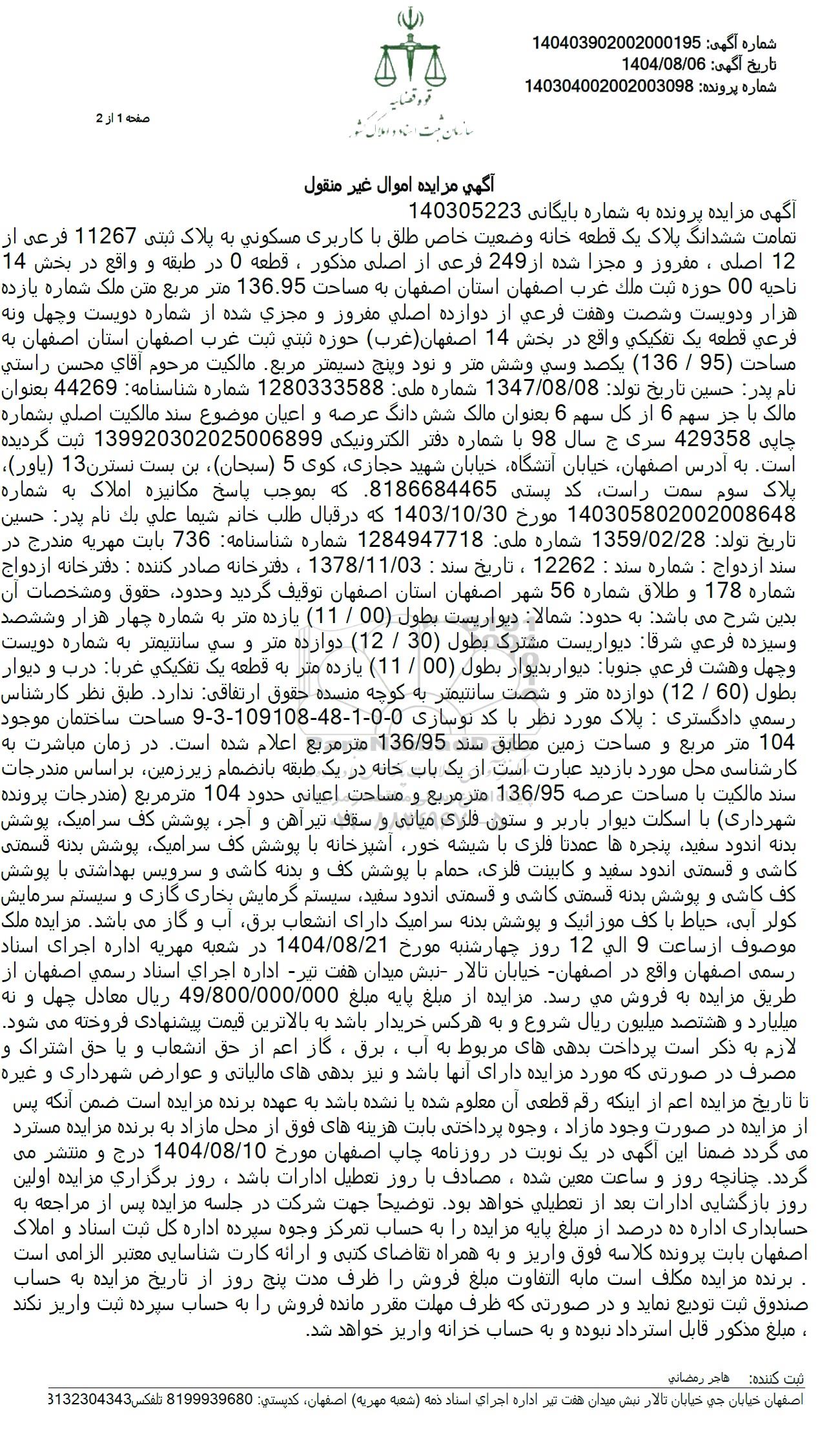آگهی مزایده پرونده به شماره بایگانی 140305223 تمامت ششدانگ پلاک یک قطعه خانه وضعیت خاص طلق با کاربری مسکونی به پلاک ثبتی 11267 فرعی از 12 اصلی، مفروز و مجرا شده از 249 فرعی از اصلی مذکور، قطعه 0 در طبقه و واقع در بخش 14 ناحیه 00 حوزه ثبت ملک غرب اصفهان استان اصفهان به مساحت 136.95 متر مربع متن ملک شماره یازده هزار و دویست و شصت و هفت فرعی از دوازده اصلی مفرور و مجری شده از شماره دویست و چهل و نه فرعی قطعه یک تفکیکی واقع در بخش 14 اصفهان (غرب) حوزه ثبتی ثبت غرب اصفهان استان اصفهان به مساحت (95) . (136) یكصد و سی و شش متر و نود و پنج دسیمتر مربع مالکیت مرحوم آقای محسن راستی نام پدر حسین تاریخ تولد : 1347.08.08 شماره ملی 1280333588 شماره شناسنامه: 44269 بعنوان مالک با جز سهم 6 از کل سهم 6 بعنوان مالک شش دانگ عرصه و اعیان موضوع سند مالكیت اصلی بشماره چاپی 429358 سری ج سال 98 با شماره دفتر الکترونیکی 139920302025006899 ثبت گردیده است. به آدرس اصفهان خیابان آتشگاه خیابان شهید حجازی کوی 5 (سبحان)، بن بست نسترن 13 (یاور) پلاک سوم سمت راست کد پستی 8186684465 که بموجب پاسخ مکانیزه املاک به شماره 140305802002008648 مورخ 1403.10.30 که در قبال طلب خانم شیما علی بك نام پدر: حسین تاریخ تولد: 1359.02.28 شماره ملی 1284947718 شماره شناسنامه 736 بابت مهریه مندرج در سند ازدواج : شماره سند : 12262 ، تاریخ سند : 1378.11.03 ، دفترخانه صادر کننده : دفترخانه ازدواج شماره 178 و طلاق شماره 56 شهر اصفهان استان اصفهان توقیف گردید و حدود حقوق و مشخصات آن بدین شرح می باشد به حدود شمالا دیواریست بطول (00 . 11 یازده متر به شماره چهار هزار و ششصد و سیزده فرعی شرقا دیواریست مشترک بطول (30) . (12) دوازده متر و سی سانتیمتر به شماره دویست وجهل و هشت فرعی جنوبا دیوار بدیوار بطول (00 . 11) یازده متر به قطعه یک تفکیکی غربا درب و دیوار یطول (60 . 12 دوازده متر و شصت سانتیمتر به کوچه منسده حقوق ارتفاقی ندارد. طبق نظر کارشناس رسمی دادگستری: پلاک مورد نظر با کد نوسازی 0-0-1-4-109108-3- مساحت ساختمان موجود 104 متر مربع و مساحت زمین مطابق سند 136.95 متر مربع اعلام شده است. در زمان مباشرت به کارشناسی محل مورد بازدید عبارت است از یک باب خانه در یک طبقه بانضمام ،زیر زمین بر اساس مندرجات سند مالکیت با مساحت عرصه 136.95 متر مربع و مساحت اعیانی حدود 104 متر مربع (مندرجات پرونده شهرداری با اسکلت دیوار باربر و ستون فلزی میانی و سقف تیراهن و آجر پوشش کف سرامیک، پوشش بدنه اندود سفید پنجره ها عمدتا فلزی با شیشه خور اشپزخانه با پوشش کف سرامیک، پوشش بدنه قسمتی کاشی و قسمتی اندود سفید و کابینت فلزی حمام با پوشش کف و بدنه کاشی و سرویس بهداشتی با پوشش کف کاشی و پوشش بدنه قسمتی کاشی و قسمتی اندود سفید سیستم گرمایش بخاری گازی و سیستم سرمایش کولر آبی حیاط با کف موزائیک و پوشش بدنه سرامیک دارای انشعاب برق آب و گاز می باشد. مزایده ملک موصوف از ساعت 9 الی 12 روز چهارشنبه مورخ 1404.08.21 در شعبه مهریه اداره اجرای اسناد رسمی اصفهان واقع در اصفهان خیابان تالار نبش میدان هفت تیر اداره اجرای اسناد رسمی اصفهان از طریق مزایده به فروش میرسد. مزایده از مبلغ پایه مبلغ 49.800.000.000 ریال معادل چهل و نه میلیارد و هشتصد میلیون ریال شروع و به هر کس خریدار باشد به بالاترین قیمت پیشنهادی فروخته می شود. لازم به ذکر است پرداخت بدهی های مربوط به آب، برق، گاز اعم از حق انشعاب و یا حق اشتراک و مصرف در صورتی که مورد مزایده دارای آنها باشد و نیز بدهی های مالیاتی و عوارض شهرداری و غیره تا تاریخ مزایده اعم از اینکه رقم قطعی آن معلوم شده یا نشده باشد به عهده برنده مزایده است ضمن آنکه پس از مزایده در صورت وجود مازاد ، وجوه پرداختی بابت هزینه های فوق از محل مازاد به برنده مزایده مسترد می گردد ضمنا این آگهی در یک نوبت در روزنامه چاپ اصفهان مورخ 1404.08.10 درج و منتشر می گردد. چنانچه روز و ساعت معین شده، مصادف با روز تعطیل ادارات باشد. روز برگزاری مزایده اولین روز بازگشایی ادارات بعد از تعطیلی خواهد بود. توضیحاً جهت شرکت در جلسه مزایده 