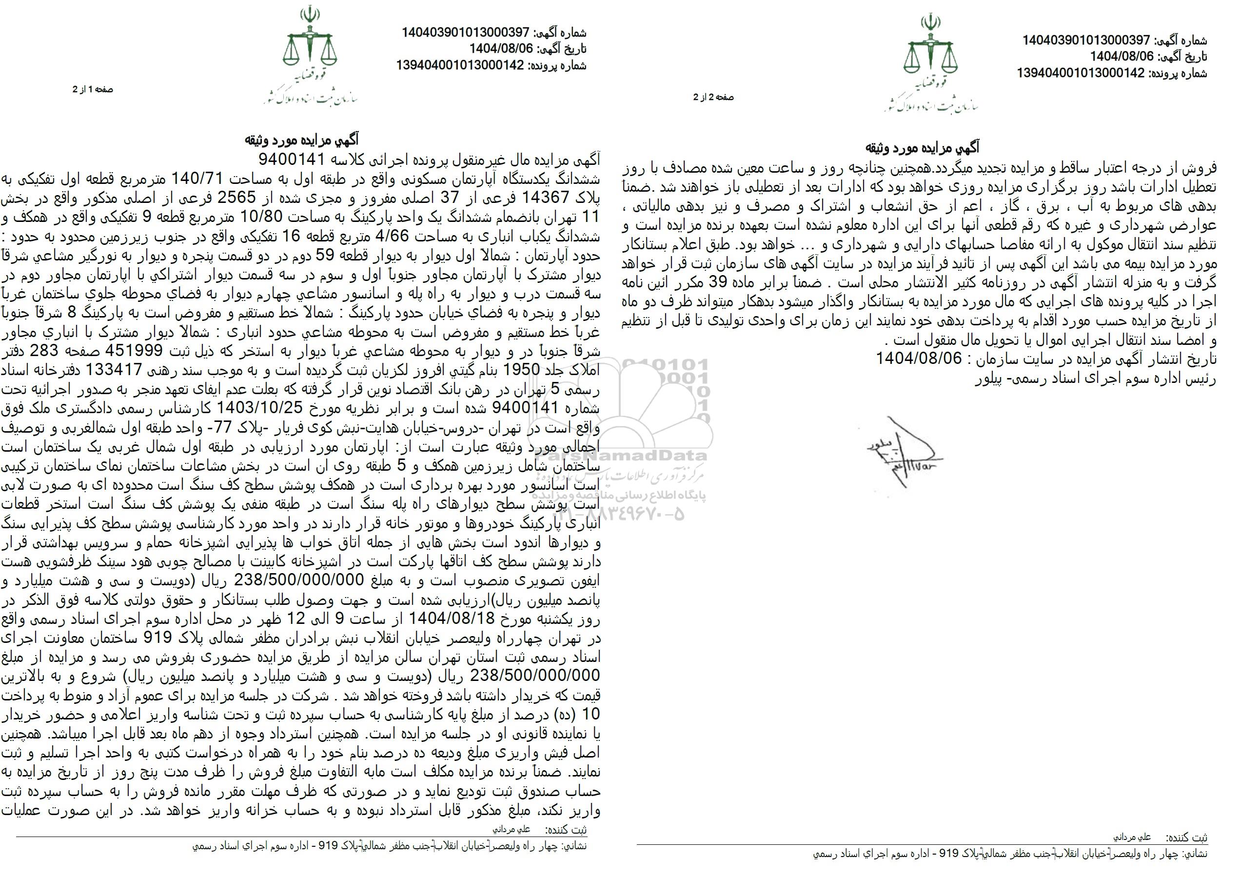 آگهی مزایده مال غیر منقول پرونده اجرائی کلاسه 9400141 ششدانگ یکدستگاه آپارتمان مسکونی واقع در طبقه اول به مساحت 140.71 متر مربع قطعه اول تفکیکی به پلاک 14367 فرعی از 37 اصلی مفرور و مجری شده از 2565 فرعی از اصلی مذکور واقع در بخش 11 تهران بانضمام ششدانگ یک واحد پارکینگ به مساحت 10.80 متر مربع قطعه 9 تفکیکی واقع در همکف و ششدانگ یکباب انباری به مساحت 4.66 متربع قطعه 16 تفكيكی واقع در جنوب زیرزمین محدود به حدود : حدود آپارتمان : شمالا اول دیوار به دیوار قطعه 59 دوم در دو قسمت پنجره و دیوار به نورگیر مشاعی شرقا دیوار مشترک با آپارتمان مجاور جنوبا اول و سوم در سه قسمت دیوار اشتراکی با اپارتمان مجاور دوم در سه قسمت درب و دیوار به راه پله و اسانسور مشاعی چهارم دیوار به فضای محوطه جلوی ساختمان غرباً دیوار و پنجره به فضای خیابان حدود پارکینگ : شمالا خط مستقیم و مفروض است به پارکینگ 8 شرقا جنوبا غربا خط مستقیم و مفروض است به محوطه مشاعی حدود انباری: شمالا دیوار مشترک با انباری مجاور شرقا جنوباً در و دیوار به محوطه مشاعی غربا دیوار به استخر که ذیل ثبت 451999 صفحه 283 دفتر املاک جلد 1950 بنام كيتي افروز لكريان ثبت گردیده است و به موجب سند رهنی 133417 دفترخانه استاد رسمی 5 تهران در رهن بانک اقتصاد نوین قرار گرفته که بعلت عدم ایفای تعهد منجر به صدور اجرائیه تحت شماره 9400141 شده است و برابر نظریه مورخ 1403.10.25 کارشناس رسمی دادگستری ملک فوق واقع است در تهران - دروس - خیابان هدایت - نبش کوی فریار - پلاک 77 واحد طبقه اول شمالغربی و توصیف اجمالی مورد وثیقه عبارت است از آپارتمان مورد ارزیابی در طبقه اول شمال غربی یک ساختمان است. ساختمان شامل زیرزمین همکف و 5 طبقه روی آن است در بخش مشاعات ساختمان نمای ساختمان ترکیبی است اسانسور مورد بهره برداری است در همکف پوشش سطح کف سنگ است محدوده ای به صورت لابی است پوشش سطح دیوارهای راه پله سنگ است در طبقه منفی یک پوشش کف سنگ است استخر قطعات انبازی پارکینگ خودروها و موتور خانه قرار دارند در واحد مورد کارشناسی پوشش سطح کف پذیرایی سنگ و دیوارها اندود است بخش هایی از جمله اتاق خواب ها پذیرایی اشپزخانه حمام و سرویس بهداشتی قرار دارند پوشش سطح کف اتاقها پارکت است در اشپزخانه کابینت با مصالح چوبی هود سینک ظرفشویی هست ایفون تصویری منصوب است و به مبلغ 238.500.000.000 ریال دویست و سی و هشت میلیارد و يا نصد میلیون ریال ارزیابی شده است و جهت وصول طلب بستانکار و حقوق دولتی کلاسه فوق الذکر در روز یکشنبه مورخ 1404.08.18 از ساعت 9 الی 12 ظهر در محل اداره سوم اجرای اسناد رسمی واقع در تهران چهارراه ولیعصر خیابان انقلاب نیش برادران مظفر شمالی پلاک 919 ساختمان معاونت اجرای اسناد رسمی ثبت استان تهران سالن مزایده از طریق مزایده حضوری بفروش میرسد و مزایده از مبلغ 238.500.000.000 ریال دویست و سی و هشت میلیارد و پانصد میلیون ریال شروع و به بالاترین قیمت که خریدار داشته باشد فروخته خواهد شد. شرکت در جلسه مزایده برای عموم آزاد و منوط به پرداخت 10 (ده) درصد از مبلغ پایه کارشناسی به حساب سپرده ثبت و تحت شناسه واریز اعلامی و حضور خریدار یا نماینده قانونی او در جلسه مزایده است. همچنین استرداد وجوه از دهم ماه بعد قابل اجرا میباشد. همچنین اصل فیش واریزی مبلغ ودیعه ده درصد بنام خود را به همراه درخواست کتبی به واحد اجرا تسلیم و ثبت نمایند. ضمنا برنده مزایده مکلف است ما به التفاوت مبلغ فروش را ظرف مدت پنج روز از تاریخ مزایده به حساب صندوق ثبت تودیع نماید و در صورتی که ظرف مهلت مقرر مانده فروش را به حساب سپرده ثبت واریز نکند مبلغ مذکور قابل استرداد نبوده و به حساب خزانه واریز خواهد شد. در این صورت عملیات فروش از درجه اعتبار ساقط و مزایده تجدید میگردد. همچنین چنانچه روز و ساعت معین شده مصادف با روز تعطیل ادارات باشد روز برگزاری مزایده روزی خواهد بود که ادارات بعد از تعطیلی باز خواهند شد . ضمنا بدهی های مربوط به آب، برق، گاز، اعم از حق انشعاب و اشتراک و مصرف و نیز بدهی 
