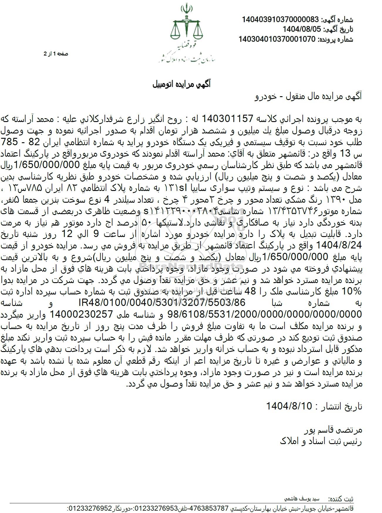 به موجب پرونده اجرائی کلاسه 140301157 له : روح انگیز زارع شرفدار کلائی علیه : محمد آراسته که زوجه در قبال وصول مبلغ یک میلیون و ششصد هزار تومان اقدام به صدور اجرائیه نموده و جهت وصول طلب خود نسبت به توقیف سیستمی و فیزیکی یک دستگاه خودرو پراید به شماره انتظامی ایران 82 - 785 س 13 واقع در قائمشهر متعلق به آقای محمد آراسته اقدام نمودند که خودروی مزبور واقع در پارکینگ اعتماد قائمشهر می باشد که طبق نظر کارشناسان رسمی خودروی مزبور به قیمت پایه مبلغ 1.650.000.000 ریال معادل یکصد و شصت و پنج میلیون ریال ارزیابی شده و مشخصات خودرو طبق نظریه کارشناسی بدین شرح میباشد : نوع و سیستم و تیپ سواری سایپا 1311 به شماره پلاک انتظامی 82 ایران 785س 13 ، مدل 1390 رنگ مشکی تعداد محور و چرخ 2 محور 4 چرخ ، تعداد سیلندر 4 نوع سوخت بنزین جمعا 5 نفر شماره موتور 13/4252746 شماره شاسی 1413290003804 وضعیت ظاهری در بعضی از قسمت های بدنه خوردگی دارد نیاز به صافکاری و نقاشی دارد لاستیکها 50 درصد اج دارد موتور هم نیاز به مرمت دارد. قابلیت تبدیل به پلاک را دارد مزایده خودرو مورد اشاره از ساعت 9 الی 12 روز شنبه تاریخ 1404.08.24 واقع در پارکینگ اعتماد قائمشهر از طریق مزایده به فروش میرسد. مزایده خودرو از قیمت پایه مبلغ 1.650.000.000 ریال معادل یکصد و شصت و پنج میلیون ریال شروع و به بالاترین قیمت پیشنهادی فروخته میشود در صورت وجود مازاد وجوه پرداختی بابت هزینه های فوق از محل مازاد به برنده مزایده مسترد خواهد شد و نیم عشر و حق مزایده نقداً وصول میگردد جهت شرکت در مزایده بدوا %10 مبلغ کارشناسی ملک را 48 ساعت قبل از مزایده به صندوق ثبت به شماره حساب سپرده اداره ثبت به شماره شبا IR48/0100/0040/5301/3207/5503/86 و شناسه 98/6108/5531/2000/0000/0000/0000/0000 و شناسه ملی 14000230257 واریز میگردد