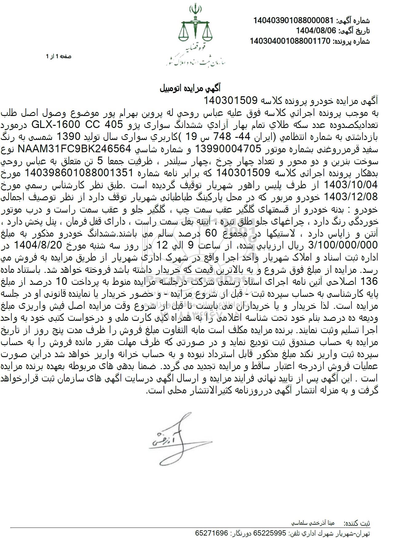 آگهی مزایده خودرو پرونده کلاسه 140301509