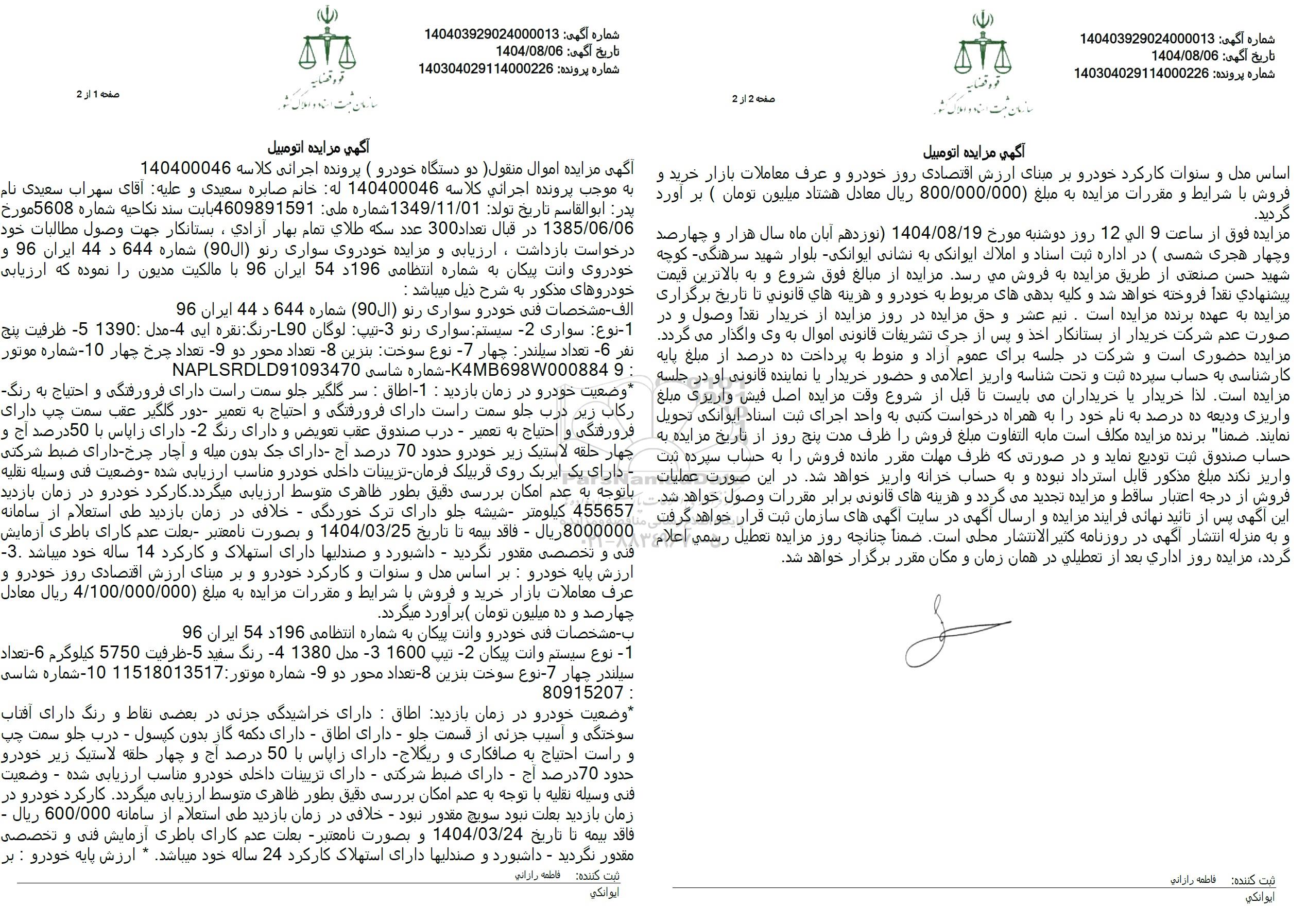 اگهی مزایده اموال منقول (دو دستگاه خودرو ( پرونده اجرائی كلاسه 140400046