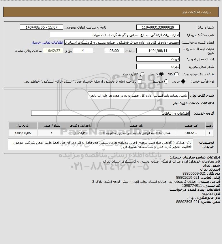 شرح کلی نیاز: تامین پهنای باند اینترنت اداره کل جهت توزیع در موزه ها وادارات تابعه