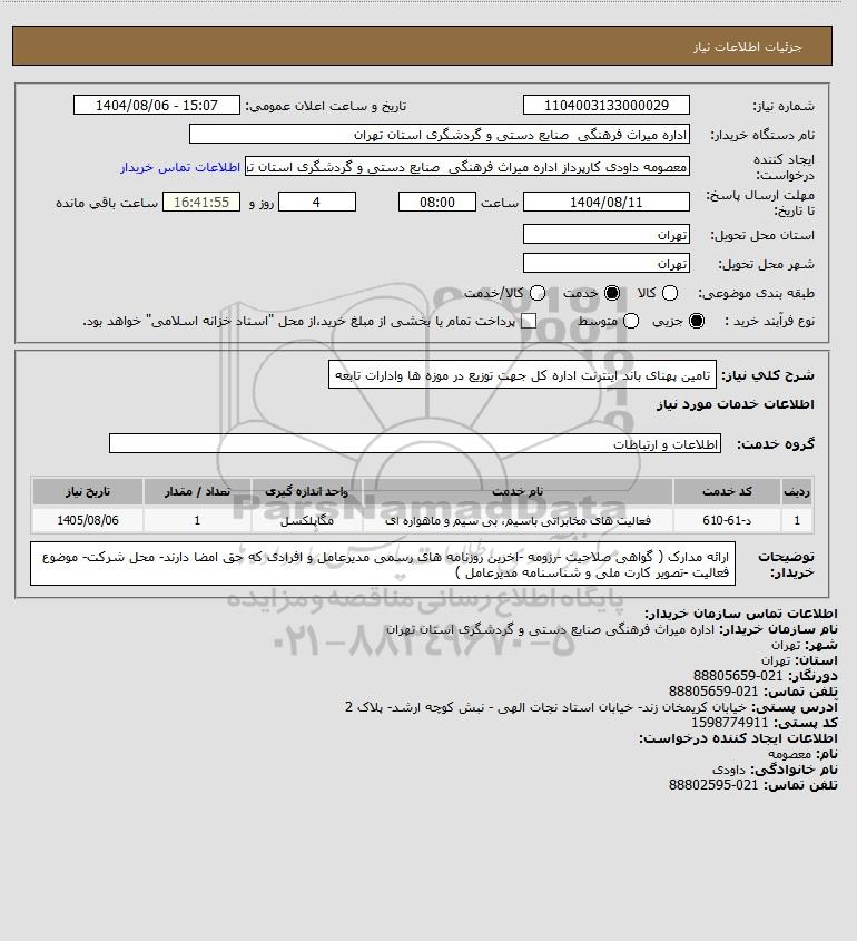 تلفن:5- 88349670 (021) فکس: 88349673 (021) Website: www.ParsNamadData.com E-mail: Info@ParsNamadData.com استعلام تامین پهنای باند اینترنت اداره کل جهت توزیع در موزه ها وادارات تابعه