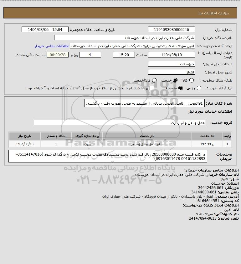 تلفن:5- 88349670 (021) فکس: 88349673 (021) Website: www.ParsNamadData.com E-mail: Info@ParsNamadData.com استعلام 91اتوبوس _ تامین اتوبوس بیابانی از مشهد به طوس بصورت رفت و برگشتی
