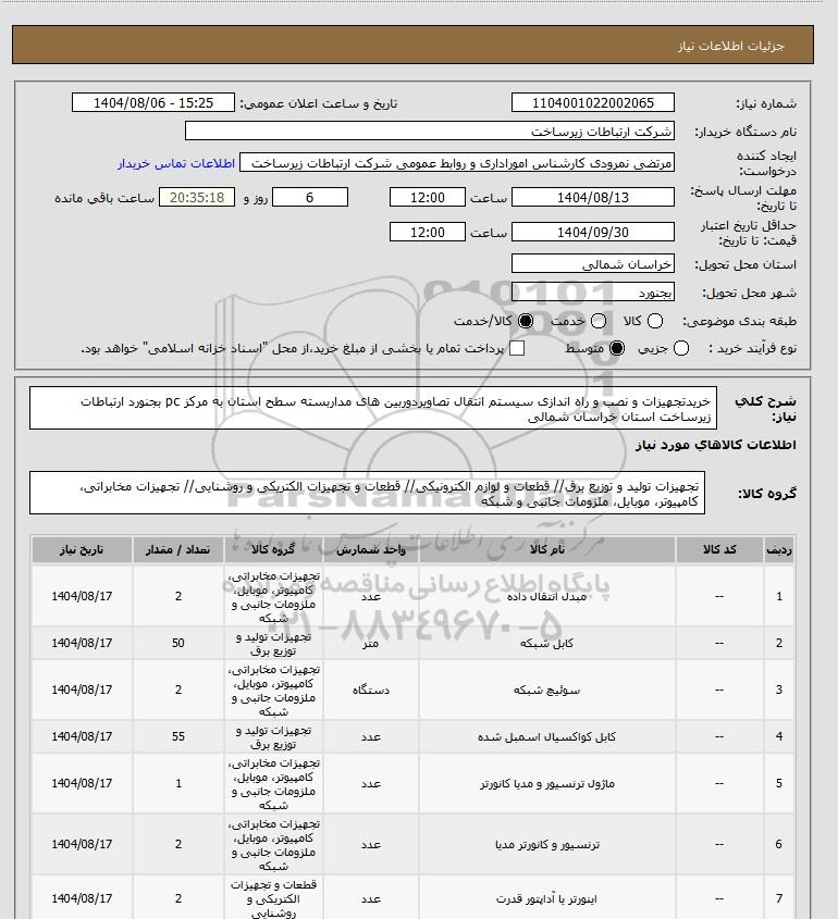 تلفن:5- 88349670 (021) فکس: 88349673 (021) Website: www.ParsNamadData.com E-mail: Info@ParsNamadData.com استعلام خریدتجهیزات و نصب و راه اندازی سیستم انتقال تصاویردوربین های مداربسته سطح استان به مرکز pc بجنورد ارتباطات زیرساخت استان خراسان شمالی