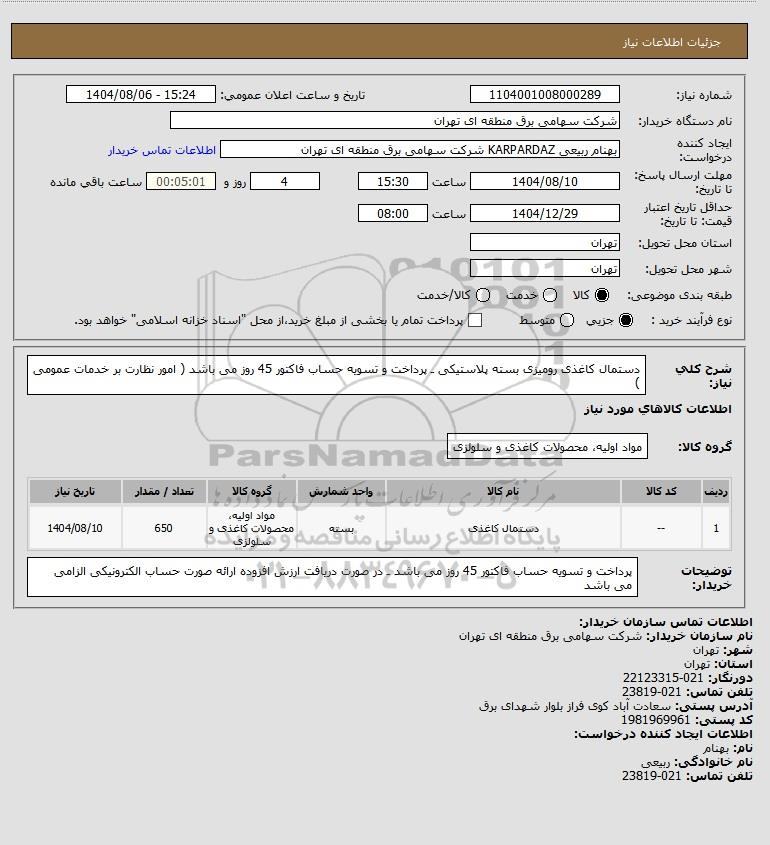 تلفن:5- 88349670 (021) فکس: 88349673 (021) Website: www.ParsNamadData.com E-mail: Info@ParsNamadData.com استعلام دستمال کاغذی رومیزی بسته پلاستیکی ـ پرداخت و تسویه حساب فاکتور 45 روز می باشد ( امور نظارت بر خدمات عمومی )