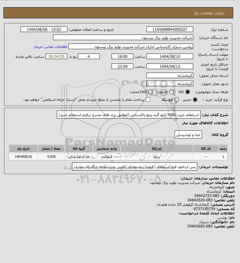 تلفن:5- 88349670 (021) فکس: 88349673 (021) Website: www.ParsNamadData.com E-mail: Info@ParsNamadData.com استعلام استعلام خرید 4000 کیلو گرم برنج پاکستانی (مطابق برند های مندرج درفرم استعلام خرید)