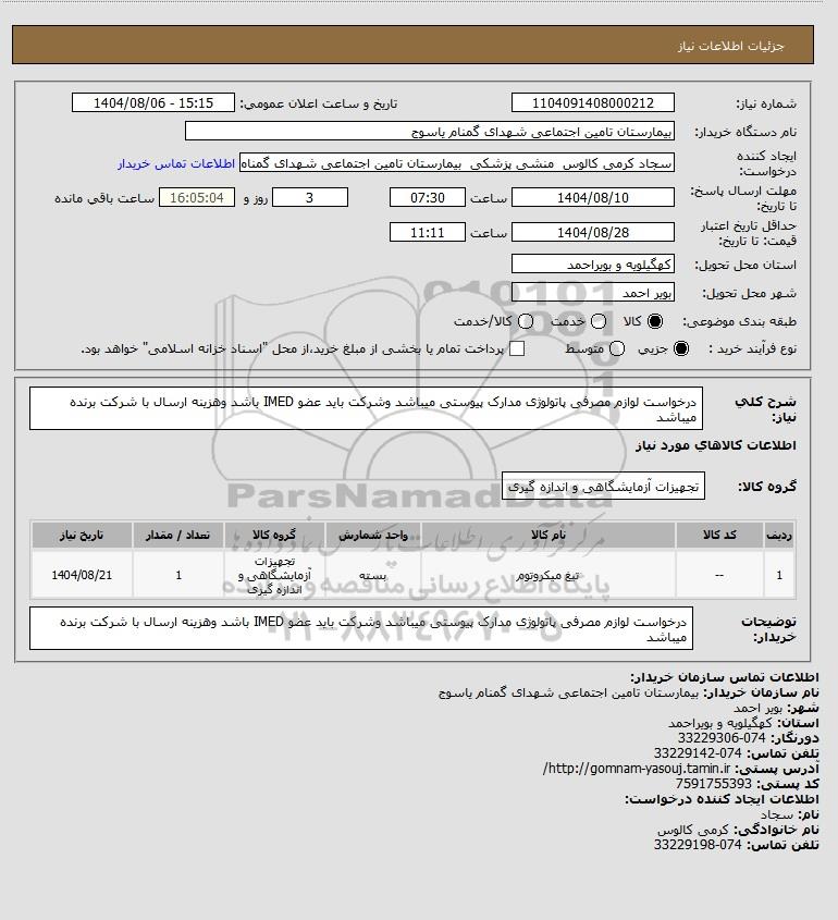 تلفن:5- 88349670 (021) فکس: 88349673 (021) Website: www.ParsNamadData.com E-mail: Info@ParsNamadData.com استعلام درخواست لوازم مصرفی پاتولوژی مدارک پیوستی میباشد وشرکت باید عضو IMED باشد وهزینه ارسال با شرکت برنده میباشد