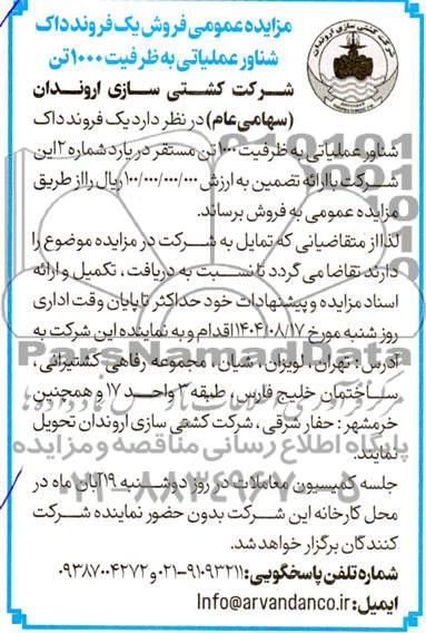 شرکت کشتی سازی اروندان (سهامی عام) در نظر دارد یک فروند داک شناور عملیاتی به ظرفیت 1000 تن مستقر در یارد شماره 2 این شرکت با ارائه تضمین به ارزش 100.000.000.000 ریال را از طریق مزایده عمومی به فروش برساند.