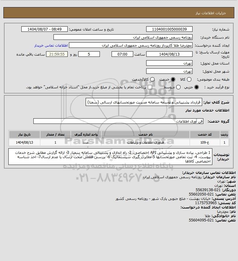 تلفن:5- 88349670 (021) فکس: 88349673 (021) Website: www.ParsNamadData.com E-mail: Info@ParsNamadData.com استعلام قرارداد پشتیبانی و توسعه سامانه مدیریت صورتحسابهای ارسالی (سمتا)