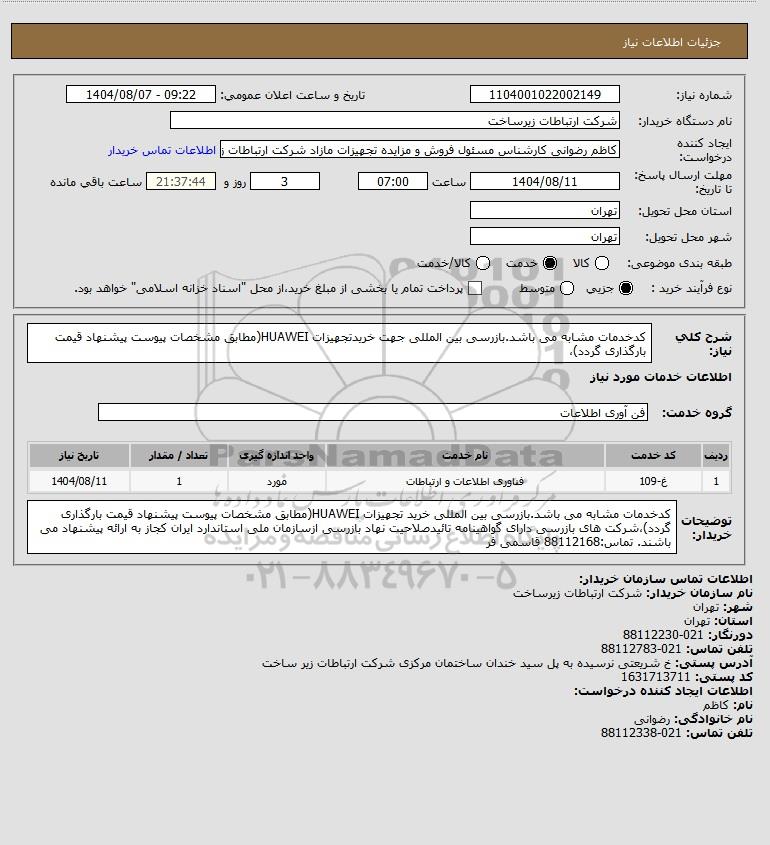 تلفن:5- 88349670 (021) فکس: 88349673 (021) Website: www.ParsNamadData.com E-mail: Info@ParsNamadData.com استعلام کدخدمات مشابه می باشد.بازرسی بین المللی جهت خریدتجهیزات HUAWEI(مطابق مشخصات پیوست پیشنهاد قیمت بارگذاری گردد)