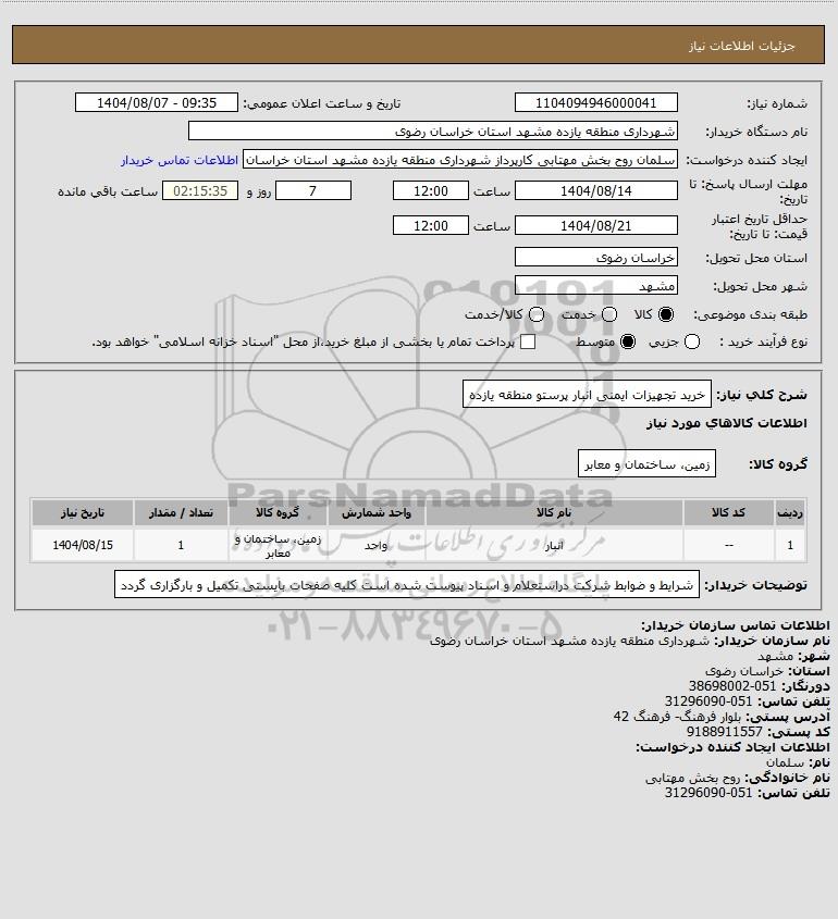 تلفن:5- 88349670 (021) فکس: 88349673 (021) Website: www.ParsNamadData.com E-mail: Info@ParsNamadData.com استعلام خرید تجهیزات ایمنی انبار پرستو منطقه یازده