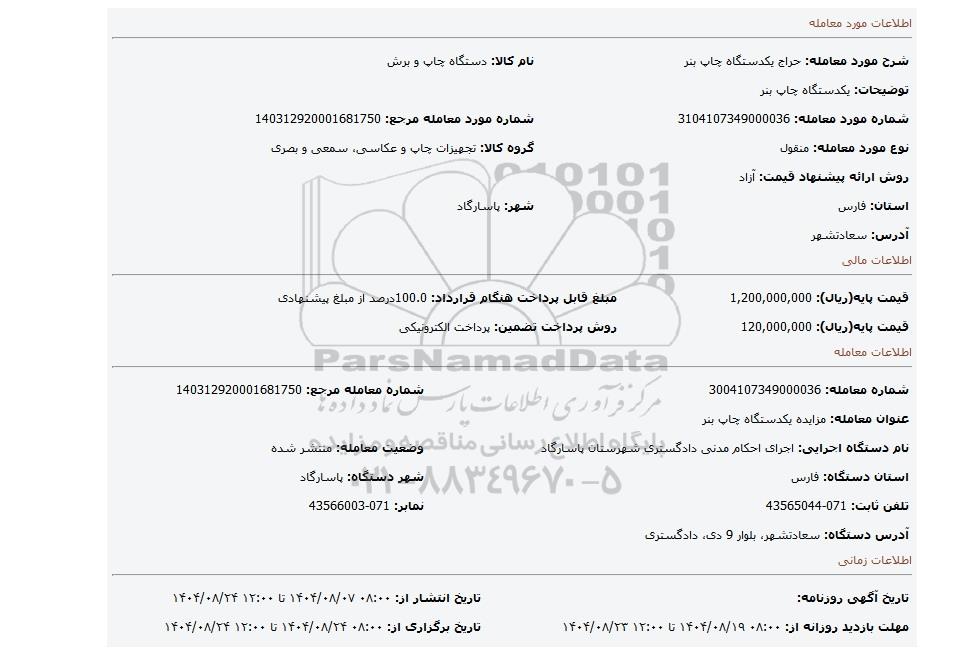 | عنوان آگهی: مزایده یکدستگاه چاپ بنر |