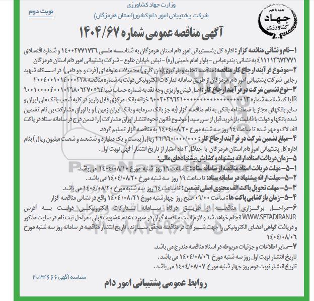 2- موضوع فرآیند ارجاع کار مناقصه: مناقصه تخلیه و بارگیری (خن کاری) محمولات علوفه ای (ذرت و جو دامی) در اسکله شهید رجایی شرکت پشتیبانی امور دام هرمزگان از طریق سامانه تدارکات الکترونیکی دولت به شماره مناقصه 2004001014000338