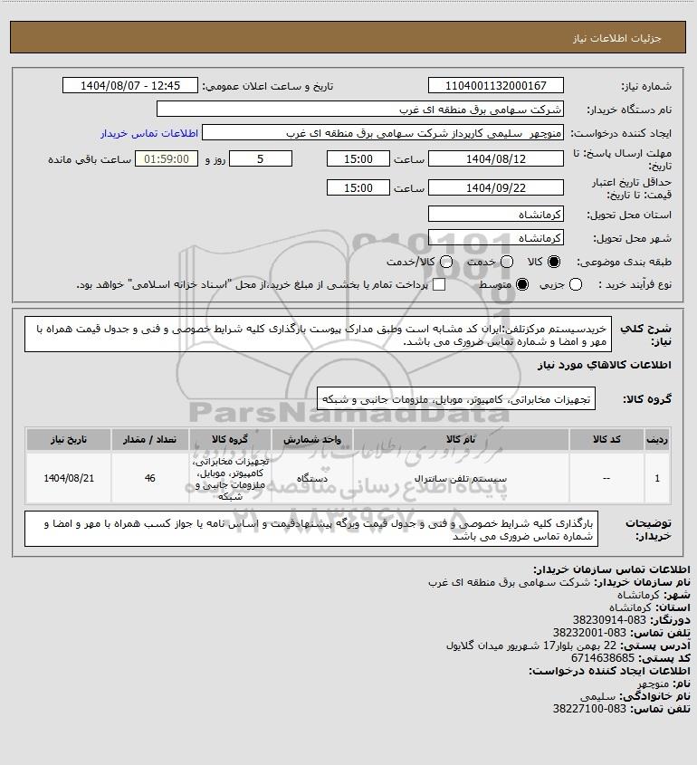 تلفن:5- 88349670 (021) فکس: 88349673 (021) Website: www.ParsNamadData.com E-mail: Info@ParsNamadData.com استعلام خریدسیستم مرکزتلفن:ایران کد مشابه است وطبق مدارک پیوست بارگذاری کلیه شرایط خصوصی و فنی و جدول قیمت همراه با مهر و امضا و شماره تماس ضروری می باشد.