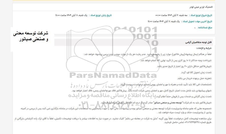 پیش فاکتور باید به نام شرکت توسعه معدنی و صنعتی صباتور صادر گردد. از درج نام اشخاص حقیقی خودداری فرمایید.