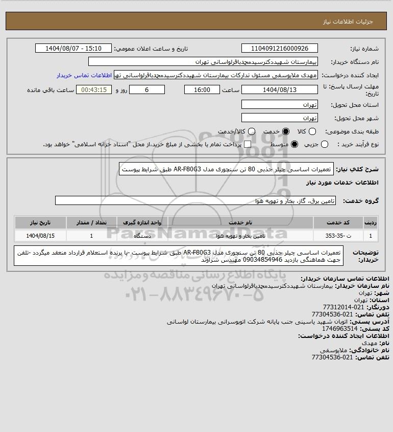 تلفن:5- 88349670 (021) فکس: 88349673 (021) Website: www.ParsNamadData.com E-mail: Info@ParsNamadData.com استعلام تعمیرات اساسی چیلر جذبی 80 تن سنچوری مدل AR-F80G3 طبق شرایط پیوست