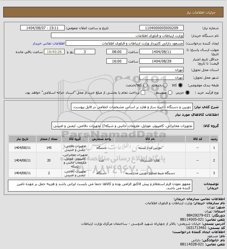 تلفن:5- 88349670 (021) فکس: 88349673 (021) Website: www.ParsNamadData.com E-mail: Info@ParsNamadData.com استعلام دوربین و دستگاه ذخیره ساز و هارد بر اساس مشخصات اعلامی در فایل پیوست.