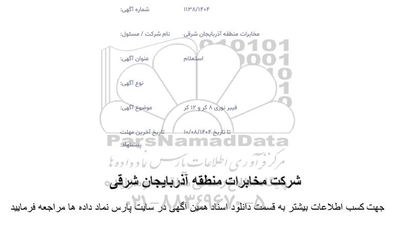 تلفن:5- 88349670 (021) فکس: 88349673 (021) Website: www.ParsNamadData.com E-mail: Info@ParsNamadData.com استعلام فیبر نوری 8 کر و 12 کر