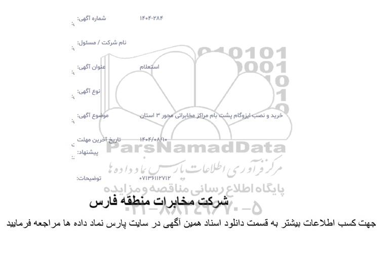 تلفن:5- 88349670 (021) فکس: 88349673 (021) Website: www.ParsNamadData.com E-mail: Info@ParsNamadData.com استعلام خرید و نصب ایزوگام پشت بام مراکز مخابراتی محور 3 استان