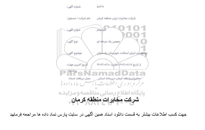 تلفن:5- 88349670 (021) فکس: 88349673 (021) Website: www.ParsNamadData.com E-mail: Info@ParsNamadData.com استعلام درخواست اجرای آسفالت