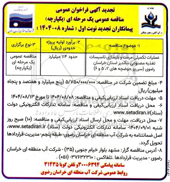 تلفن:5- 88349670 (021) فکس: 88349673 (021) Website: www.ParsNamadData.com E-mail: Info@ParsNamadData.com مناقصه عملیات تکمیلی مرمت و بازسازی تاسیسات ... تجدید